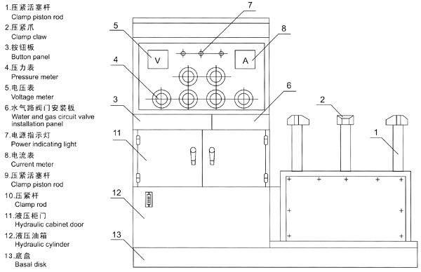 (4)點動夾緊爪,夾緊被測蝶閥(法蘭或平面);(5)按增壓扭至所需壓力(夾緊油缸所需壓力對照表)(貼在機上)。增壓按鈕可多次點動,每次間隔若三秒鐘左右, (指第一次按下未達到所需壓力時)。最高壓力32MPa;(6)進行水壓或氣壓對被試蝶閥進行測試;(7)測試完 畢后,打開放水或氣開關,泄掉壓力即可; (8)先后按各放松鈕,將被測閥門取下。