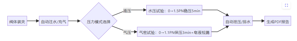 閥體裝夾 自動注水/充氣 壓力模式選擇 水壓試驗:0→1.5PN穩壓5min 氣密試驗:0→1.1PN保壓3min+皂液檢漏 自動泄壓/排水 生成PDF報告